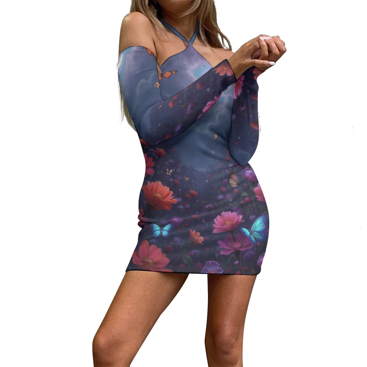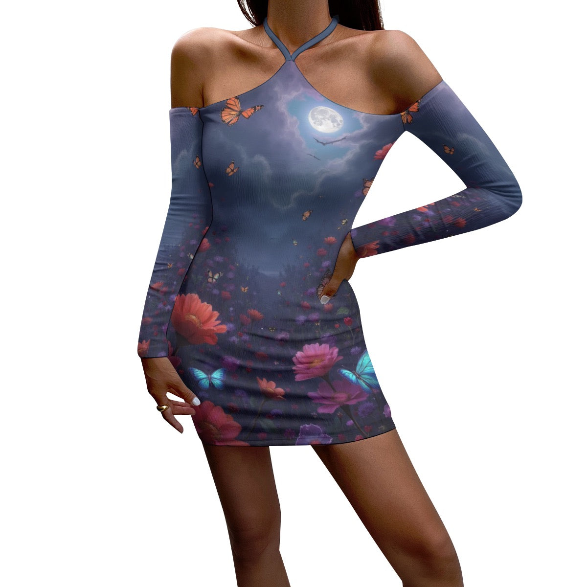 La robe présente une coupe courte, un détail à épaules dénudées avec des manches longues, un licou, extensible et doublé. C'est une robe sexy pour femmes